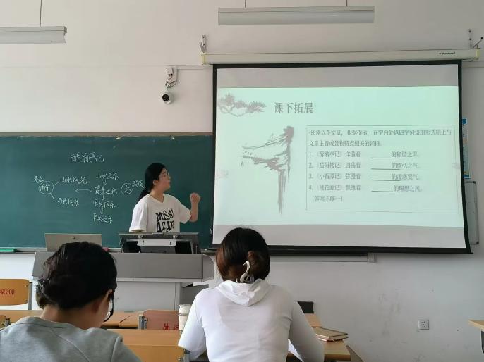 第二阶段,见习学生共分为13组进行教育模拟试讲,分别由13位校内教师负责,同时部分教育实习基地教师参与指导。学生见习篇目涉及古诗文《岳阳楼记》、《醉翁亭记》、《行路难》,现代诗歌《沁园春·长沙》、《祖国呀,我亲爱的祖国》以及现代散文《紫藤萝瀑布》等,学生们与指导教师不断打磨说课稿、讲课稿,精益求精,反复练习。这一阶段,学生将所学的基础理论、基本知识和基本技能,进行教学设计,并模拟试讲,初步形成从事中学语文教育工作的基本能力。