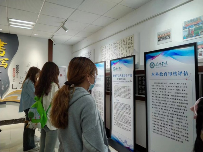 在本科教育审核评估即将到来之际,为进一步营造迎评氛围,提高广大师生对本科教育审核评估的认识,增强责任感和主人翁意识,深入理解本科教育审核评估的意义、作用、价值、内容、关键指标点等知识,文学院面向全院师生举办本科教育审核评估知识面面观活动。在博文楼三楼就教育审核评估的相关重点知识制作了12块展板,组织学生认真学习,并配有转任教师向学生讲解审核评估的相关知识。