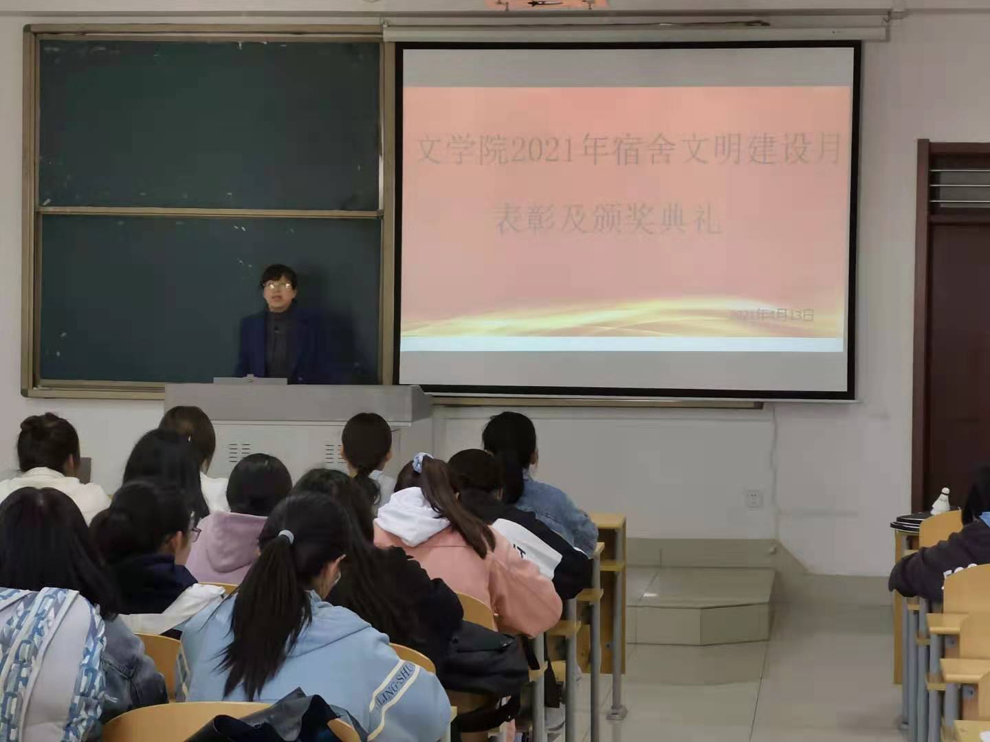 为进一步加强党史学习教育,营造学党史、学榜样的良好氛围,做好疫情防控期间学生宿舍卫生健康工作,培养学生良好的生活卫生习惯,营造干净整洁、健康文明的宿舍环境,不断深化bwin·必赢文明校园建设,打造“思想引领、学业解惑、生活服务、行为指导、文化浸润”五位一体的温馨家园,4月13日下午,文学院在博文楼431教室成功举办2021年“文明宿舍建设月”活动表彰及颁奖典礼。