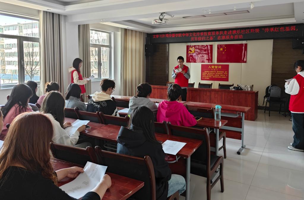 为了传承红色基因,弘扬革命精神,3月19日,文学与新闻传播学院中华文化传承教育服务队走进康乐社区开展“传承红色基因,筑牢信仰之基”志愿服务活动。