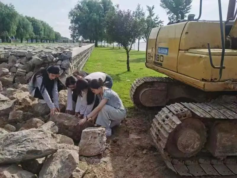 黄河坝上堆砌着整齐的石头堆,据了解,它的名字叫做防石跺。实践团来到王庄险工的日子正巧,有幸遇见修砌防石跺的工人们,与他们交流中实践团了解到关于防石跺的用途:其建设的主要目的是为了在汛期期间,能及时利用防石跺进行险情的抢护;另外还可在黄河汛期后根据根石探摸,检查是否有根石走失的情况,有利于黄河的维护。修砌师傅让实践团搬一搬堆砌防石跺的石头,身临其境的体验一下,石块极重,实践团四个人合力都无法动摇其一块。之后师傅们引导实践团去看坝下黄河边的石头堆,他们告诉实践团,坝下的石堆对于黄河防汛同样重要,那些石碓既可以形成新的应水面保护黄河大堤,又能够保护堤岸不受黄河来水的直接冲蚀而产生掏刷破坏的作用。经过防石跺边的实践学习,使得实践团更加佩服参与黄河防汛工作中的人们,眼前的防石跺映现了他们伟岸的身影。实践团学习到他们吃苦耐劳、勤于工作的精神,会更加珍惜在学校里良好的学习环境,努力实现自己的人生价值;尊重每一位黄河治理事业中的工作者,宣扬好关于黄河防汛的知识。
