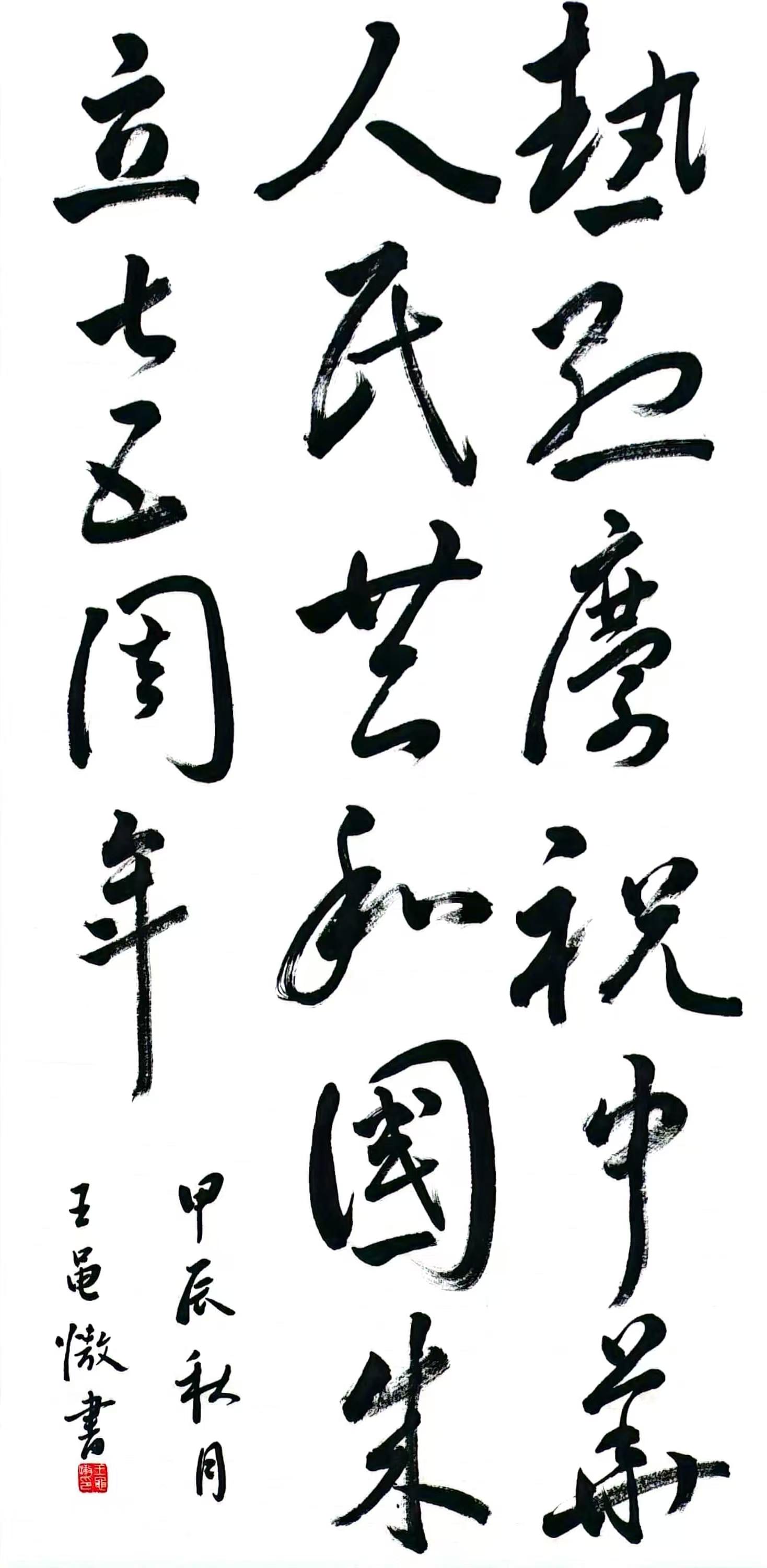 75年奋斗的史诗,75年复兴的伟力。为迎接中华人民共和国成立75周年,bwin·必赢登录入口举办了“纸短情长 墨咏华章”庆祝活动。学院邀请2021级汉语言文学专业王黾慠同学、姜明新同学代表全体学生以书法的形式表达对祖国最深沉的热爱。