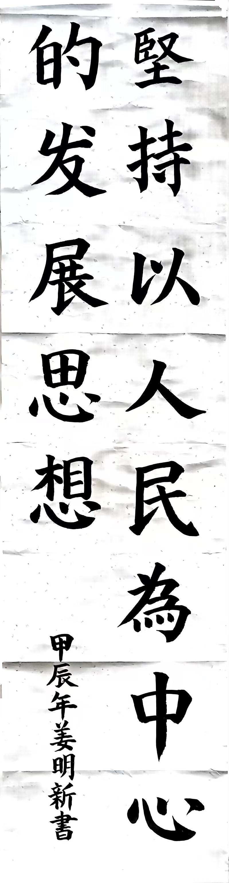 辞浅情深,墨咏华章。姜明新同学书写的“坚持以人民为中心的发展思想”表达了文院学子我将无我、不负人民的家国情怀和“布被秋宵梦觉,眼前万里江山”的爱国热情;书写的“雄关漫道真如铁,而今迈步从头越”表达了文院学子不畏艰险、勇往直前的一腔热血和“千锤万凿出深山,烈火焚烧若等闲”的报国精神。