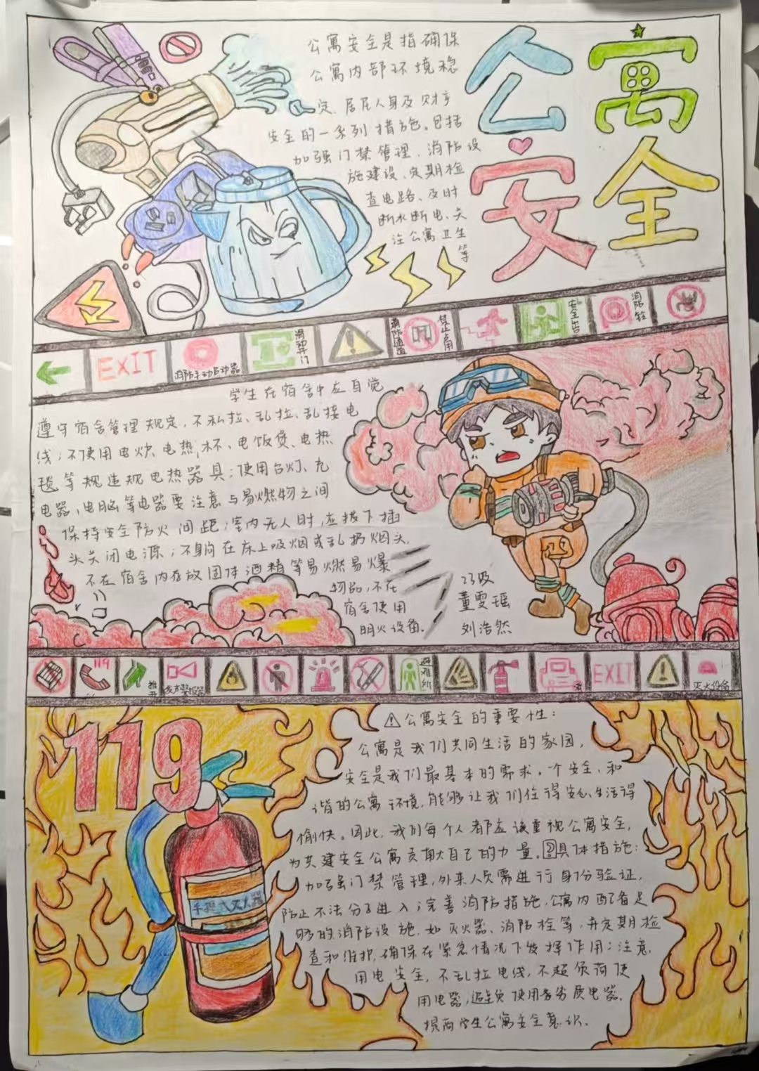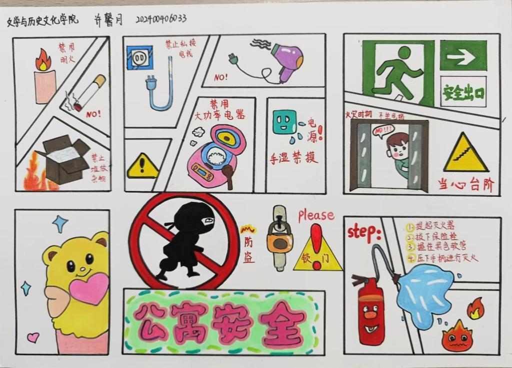 活动期间,同学们积极响应,踊跃参与。他们根据自身喜好,自由选择油画、水彩画等多种绘画形式进行创作。在创作过程中,同学们深入挖掘公寓安全知识,从消防安全,如灭火器的正确使用方法、消防栓的位置及作用,到用电安全,如合理使用电器、避免电线乱拉乱接,再到防盗安全和应急安全等各个方面,将这些知识巧妙地融入作品之中。通过绘画表达,不仅让自己更加深入地理解了安全知识,还掌握了更多实用的防范技能,进一步提升了自身的安全意识。