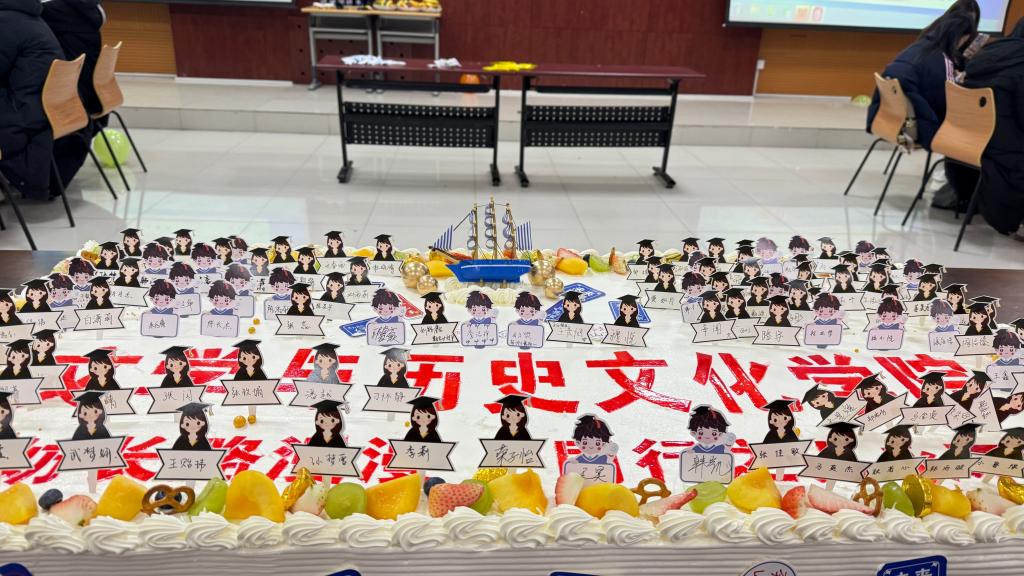 “冬至阳生春又来”,在这个岁末的冬至佳节,暖冬活动于激昂的歌声中热烈开场。动人的旋律似冬日暖阳,瞬间驱散寒意,点燃了现场的热情,将大家带入轻松愉悦的氛围。此时,户外虽寒风凛冽,室内却暖意融融,一场温馨欢乐的聚会正当时。在食材准备过程中,各种趣味小游戏轮番登场。在你画我猜中,比划的同学手脚并用,猜词的同学全神贯注,欢笑声此起彼伏;抢凳子环节,参与者绕凳疾转,音乐停即抢座,伴随着同学们的呐喊助威,将现场气氛推向高潮。这些游戏不仅带来了欢乐,更在无形中增进了同学们之间的了解与信任,让大家在轻松的氛围中学会了团队协作与沟通技巧。伴随着游戏的欢乐进行,大家亲手制作的饭团、热气腾腾的饺子,以及散发着宜人香气的冬日养生茶纷纷被端上桌来,同学们围坐一处,畅快地品尝着自己的劳动成果,家人们虽不在身边,但此刻身边的伙伴就是亲人,大家心连着心,一同度过这个特别的冬至,让团圆之情在温暖的氛围中不断延续。
