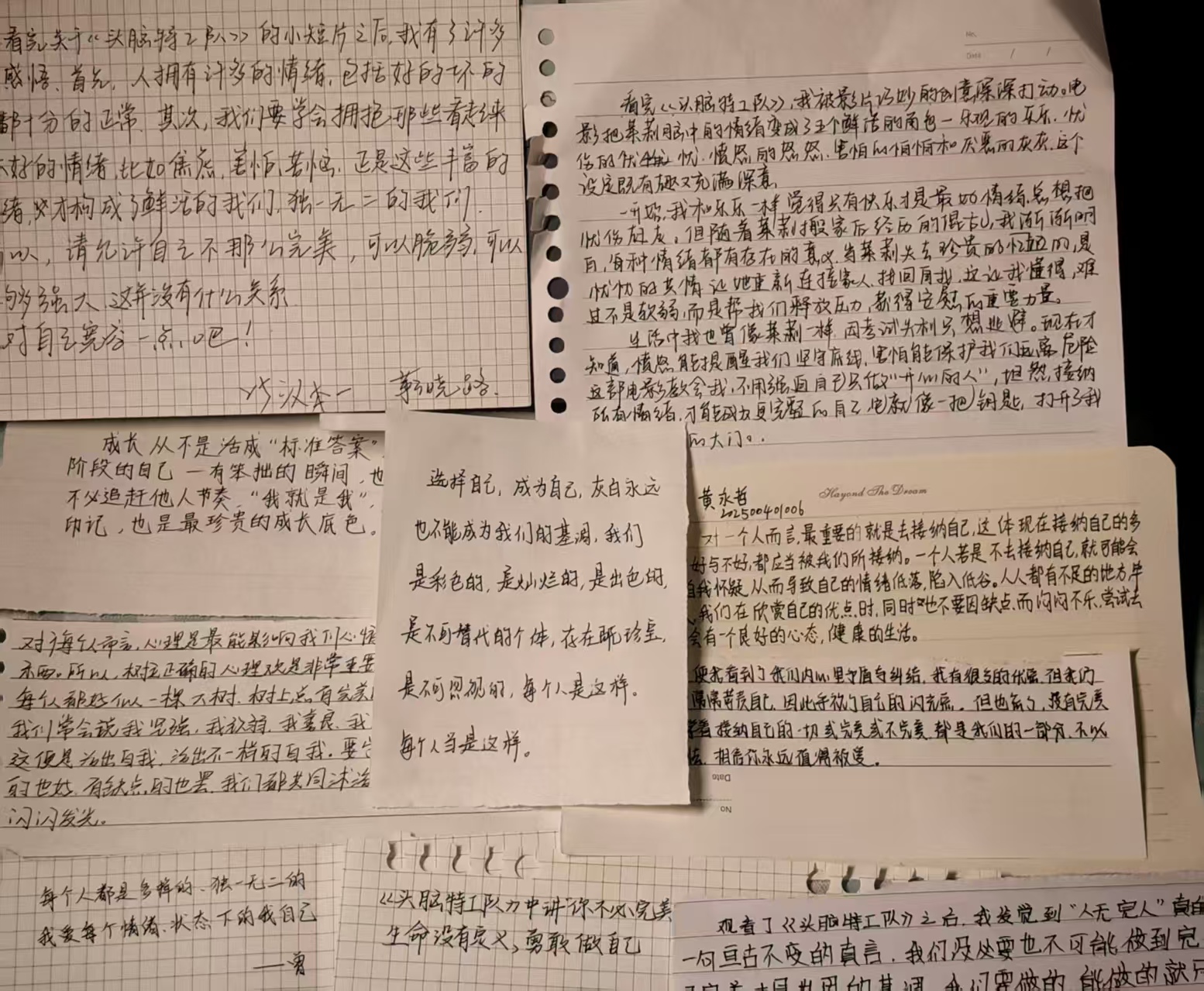 活动以“情绪初印象”破冰环节开场,同学们围绕“喜、怒、哀、惧、厌”五种情绪,分享近期生活中的情绪故事,引出对情绪管理的初步思考。随后,大家集体观看动画电影《头脑特工队》,影片以生动具象的方式,将情绪在脑海中的运作机制可视化,进一步加深了同学们对情绪功能与互动的理解。观影结束后,学生们完成手写感悟并进行互动分享,将影片内容与自身情绪体验结合起来,明确情绪的多元属性及不同情绪在自我成长中的作用。