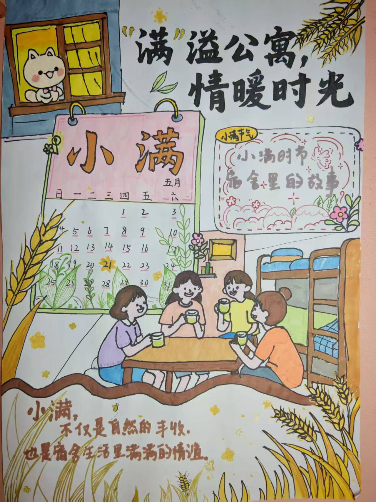 在活动中,各宿舍围绕“小满与公寓生活”这一温馨主题展开了丰富多元的创作之旅。征文组的同学们以细腻笔触记录下宿舍生活的点点滴滴,并精心搭配生活照片,将温馨趣事、节气感悟融入字里行间,让每一份情感都跃然纸上。海报组的成员们则挥洒画笔,创作出一幅幅色彩斑斓、构思巧妙的作品,巧妙地将小满节气的寓意与集体生活相融合。同学们不仅加深了对彼此的了解,更在思维的碰撞与情感的共鸣中,发现了独创的有趣想法和才华。