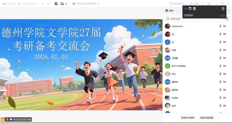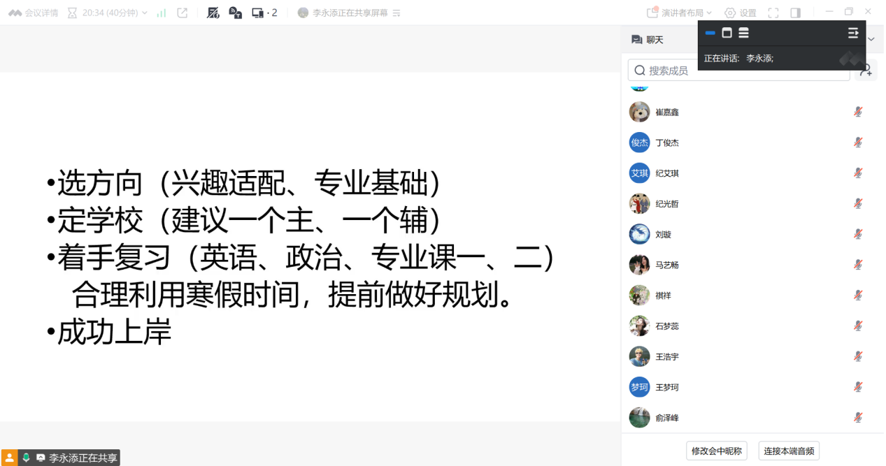 首先,汉语言文学专业系主任李永添博士针对前期学生所反映的普遍性问题做了解答,并指出27届学生应确定考研方向后,选择自己能够通过努力达到的学校,避免目标过高的现象,还需考虑学校考试方式,如大综合(涉及面广但难度较低)或小综合(内容集中但难度较高)。同时,在确定学校时,李老师建议选择一个主校和一个备选学校,以应对招生名额突然缩招的情况。