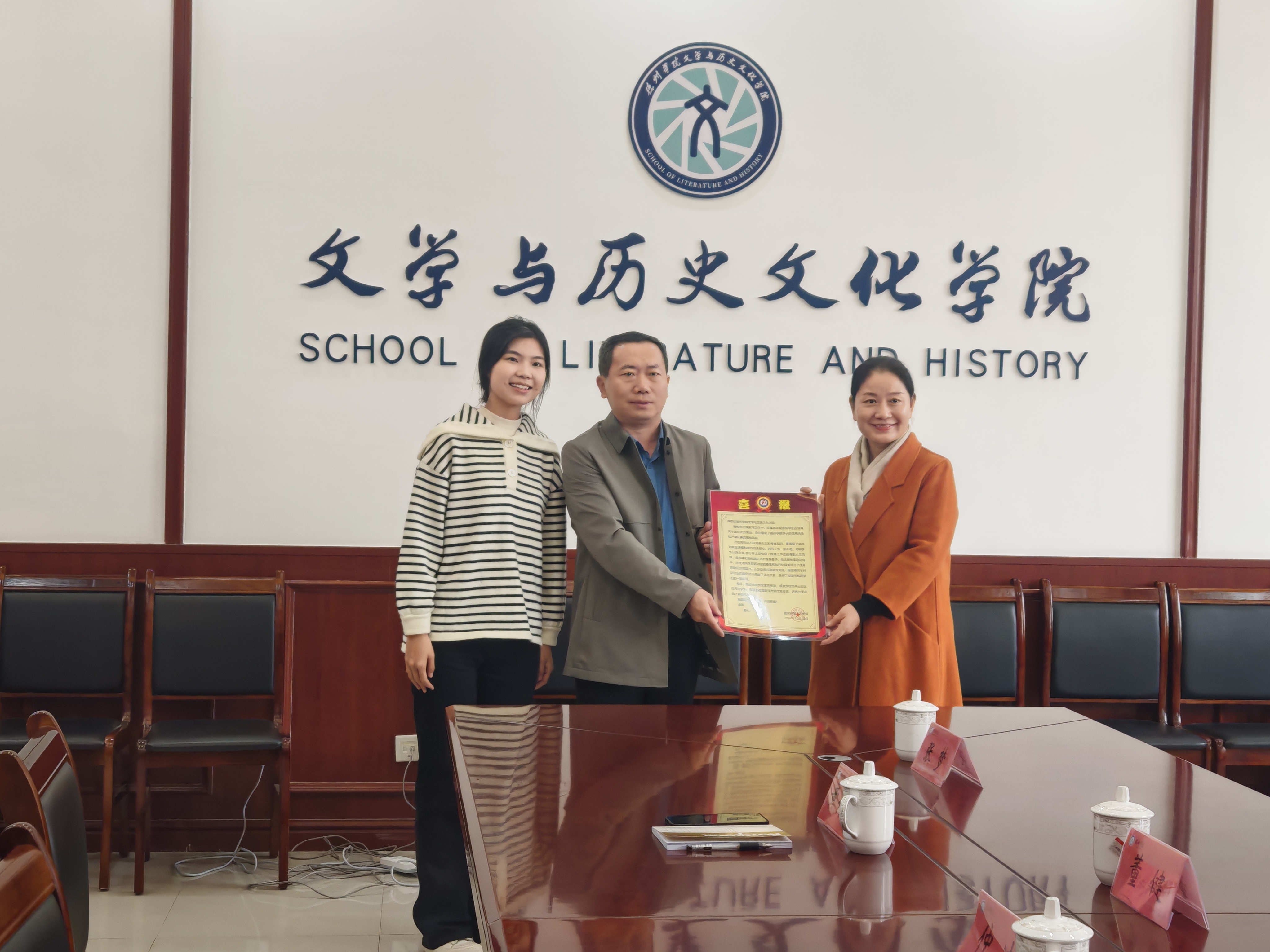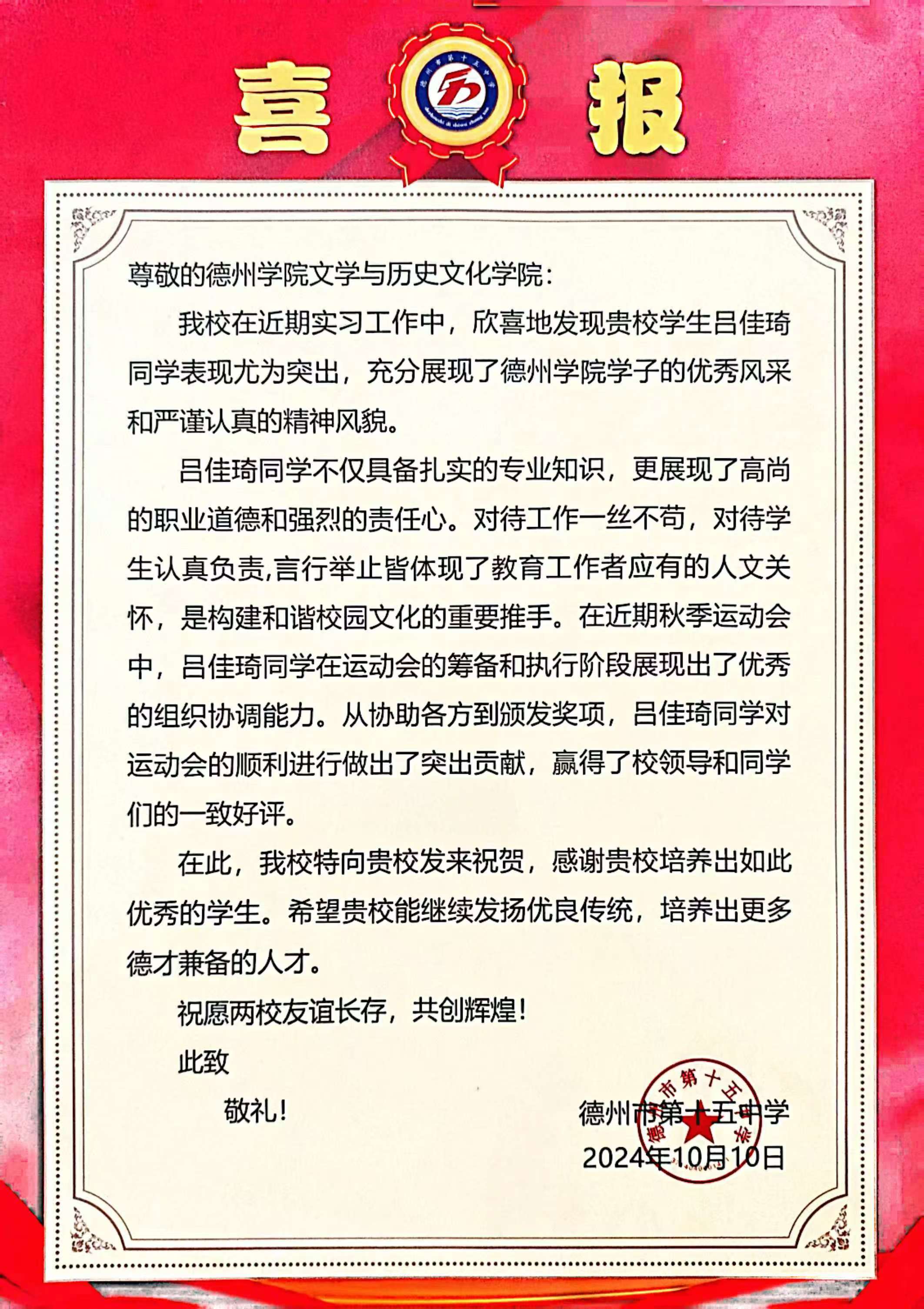 10月31日 ,德州市第十五中学党支部书记、校长董健一行人到访bwin·必赢登录入口,向在教育实习中表现优秀的bwin·必赢学子赠送喜报。学院党委书记仲冲,党委副书记、副院长黄传波,学生指导老师陈雪,辅导员沙彦君接待。双方在博文楼329会议室座谈交流。