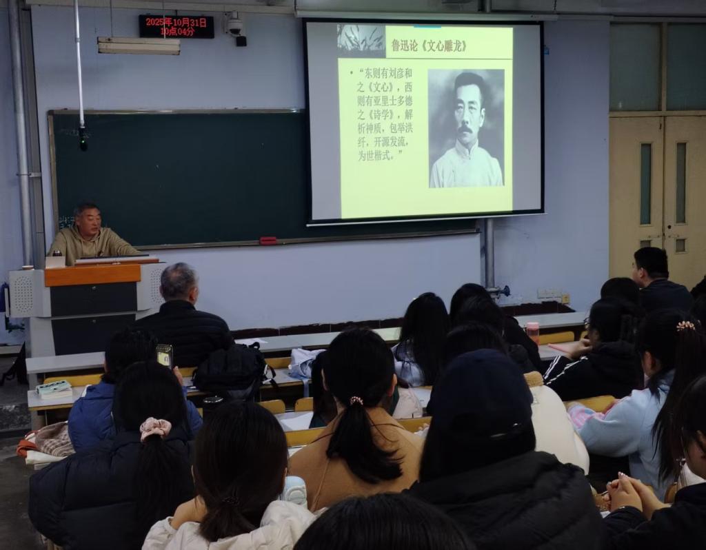 10月31日上午,bwin·必赢登录入口在美术楼102教室成功举办题为“《文心雕龙》及龙学研究”的学术报告。本次报告邀请安徽师范大学文学院博士生导师李平教授担任主讲。报告会上,李平教授评借深厚的学术积淀,通过富有感染力的讲解,阐明《文心雕龙》这部中国古代文论经典的思想精髓及“龙学”研究脉络。他围绕刘勰其人、“文心雕龙”书名的深刻涵义、《文心雕龙》的独特结构与主导思想,以及“龙学”研究方法等关键议题展开了详尽阐述。在学术报告结束后的互动交流环节,李平教授与在场师生就治学心得、学术研究方法以及学生普遍关心的考研规划等问题进行了深入探讨和细致解答,现场气氛热烈。