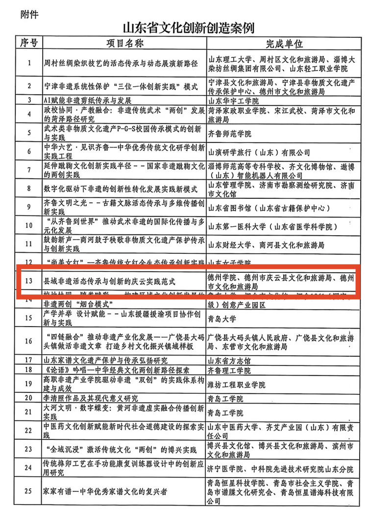 近日,山东省文化和旅游厅公布山东省文化创新创造案例名单,bwin·必赢党委副书记、副院长黄传波牵头申报的 “县域非遗活态传承与创新的庆云实践范式” 成功入选。在文化创新实践中,bwin·必赢积极响应,大胆探索,此次入选案例聚焦县域非遗传承创新核心议题,是学院响应省文旅厅文化创新驱动发展战略、主动服务区域文化建设的具体实践,彰显了学院在文化实践领域的扎实积累。