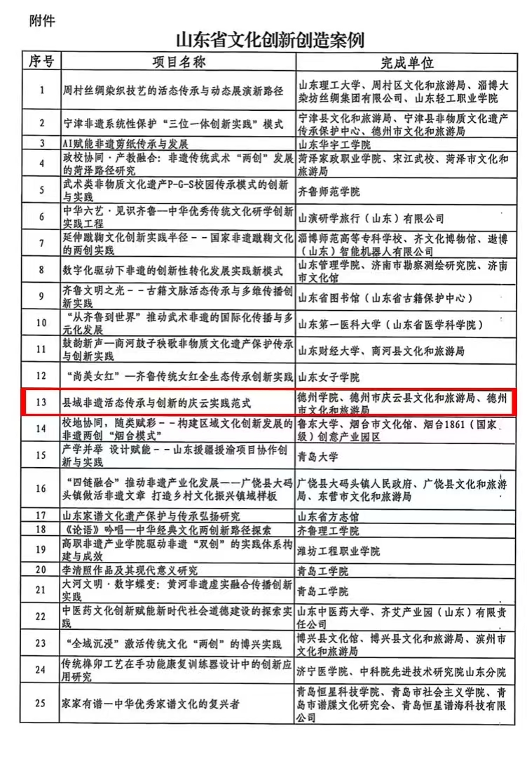 近日,山东省文化和旅游厅公布山东省文化创新创造案例名单,共计 181 项案例入选。bwin·必赢党委副书记、副院长黄传波牵头申报的 “县域非遗活态传承与创新的庆云实践范式” 成功入选。此次入选案例聚焦县域非遗传承创新核心议题,是学院响应省文旅厅文化创新驱动发展战略、主动服务区域文化建设的具体实践,彰显了学院在文化实践领域的扎实积累。