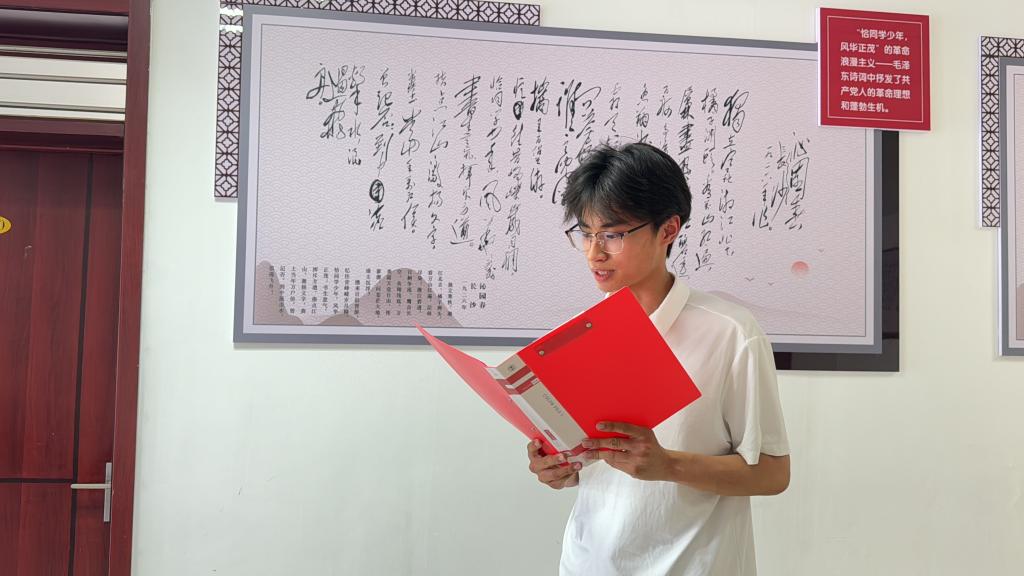 学生党员们以饱满的热情集体朗诵了《沁园春·长沙》和《七律·长征》两首经典诗词。在铿锵有力的朗诵声中,革命英烈们到中流击水,浪遏飞舟的豪迈气概和红军不怕远征难的大无畏精神深深感染着在场的每一位党员。朗诵结束后,一场“行走的党课”随即展开,学生党员代表结合诗词创作时的革命背景,生动讲述了两首诗词背后的党史故事,将诗词中蕴含的革命理想与斗争精神娓娓道来,让红色记忆在新时代焕发新的生命力。